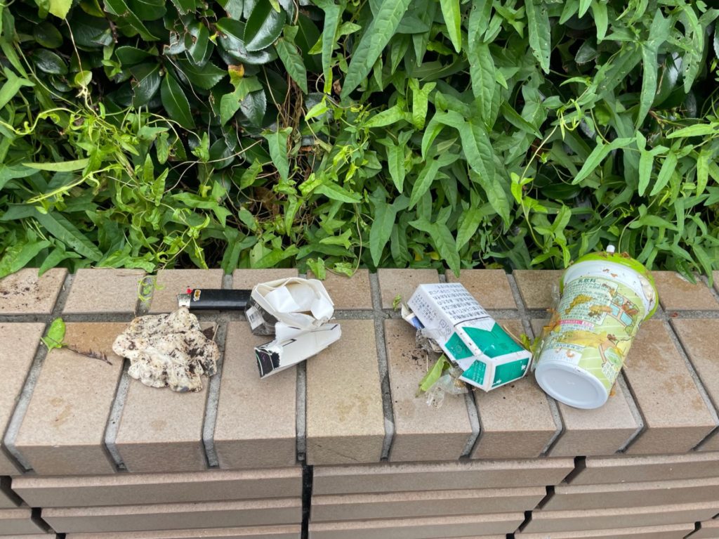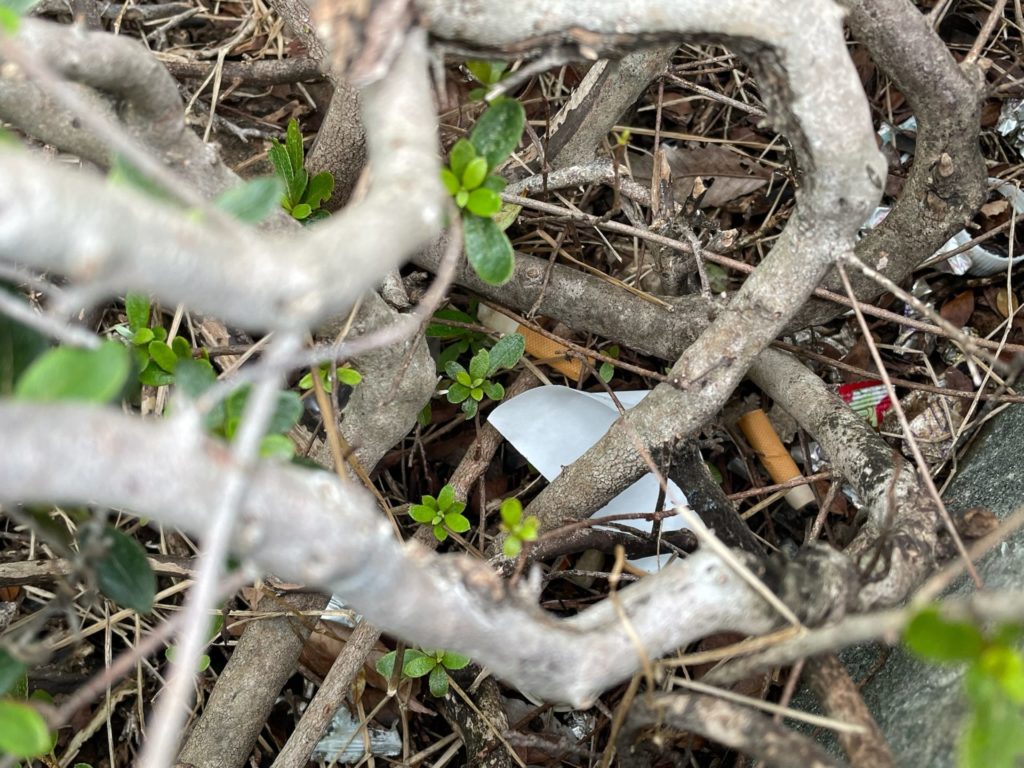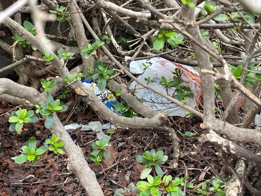 植え込みには風で飛ばされたゴミが引っかかることもありますが、植え込みの中にあるのはだいたいポイ捨て(不法投棄です)